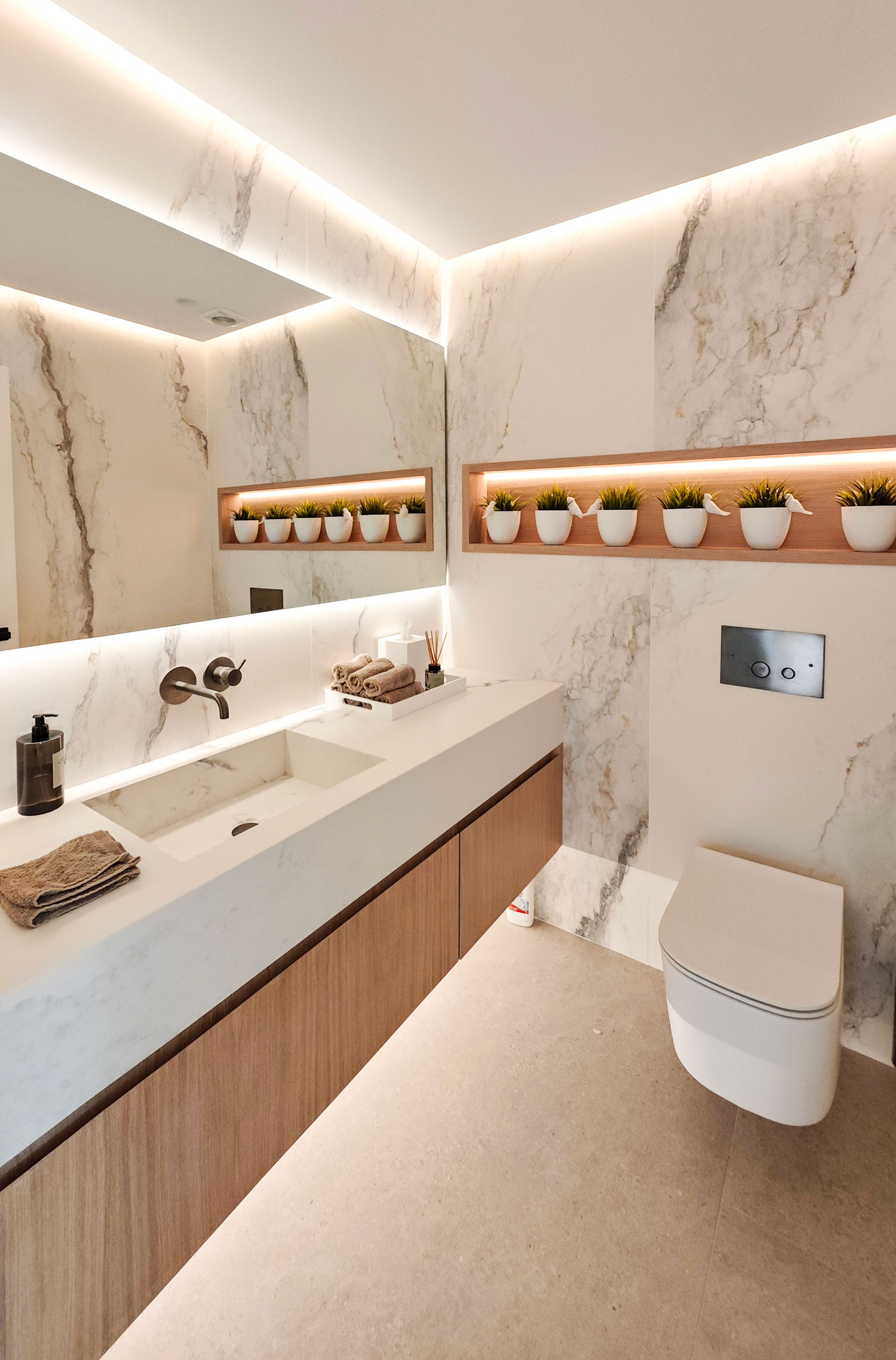 Cada baño cuenta con muebles fabricados a medida, pensados para ofrecer durabilidad a largo plazo: