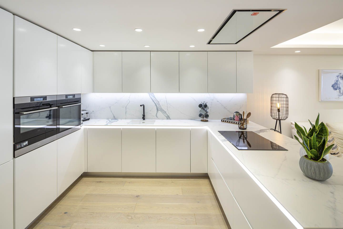 These were two adjoining apartments, for which our client wanted the same design and use of space, but with a different touch. And so we did! Both apartments have custom-made kitchen cabinets in white and straight lines, but the different countertops give them a style of their own.